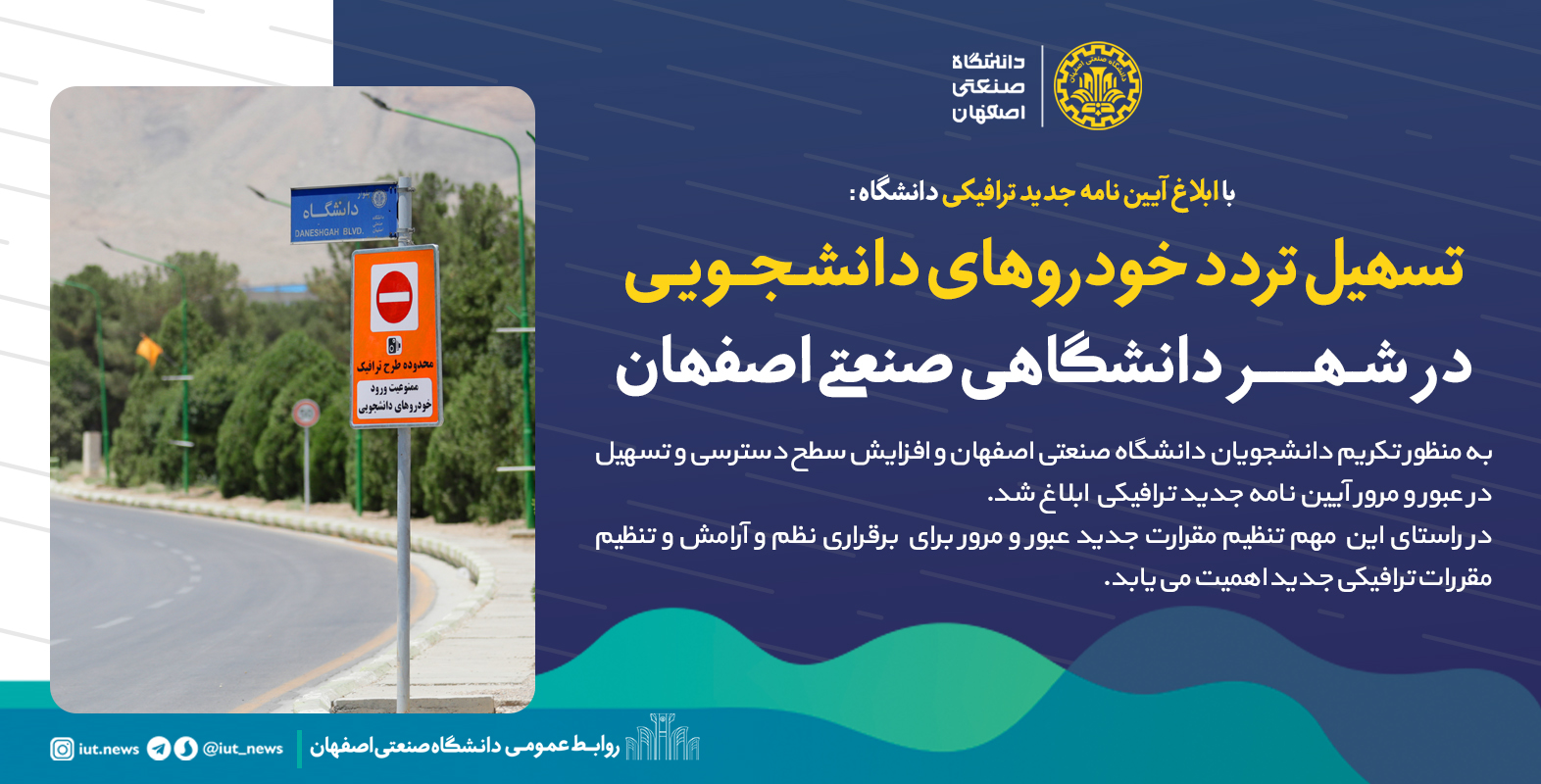 اکنون دانشگاه صنعتی اصفهان به منظور تکریم دانشجویان تصمیم گرفته است این سطح دسترسی و تسهیل در عبور و مرور را افزایش دهد. به تبع آن تنظیم مقرارت جدید عبور و مرور برای برقراری نظم و آرامش و تنظیم مقررات ترافیکی جدید اهمیت می یابد. مرکز کنترل ترافیک دانشگاه صنعتی اصفهان بر اساس فضاهای اختصاص یافته پارکینگ و نیازهای مراجعین، طرح جدید ترافیکی دانشگاه را به تصویب هئیت رئیسه رسانده و این طرح از تیرماه سال جاری لازم الاجرا است.