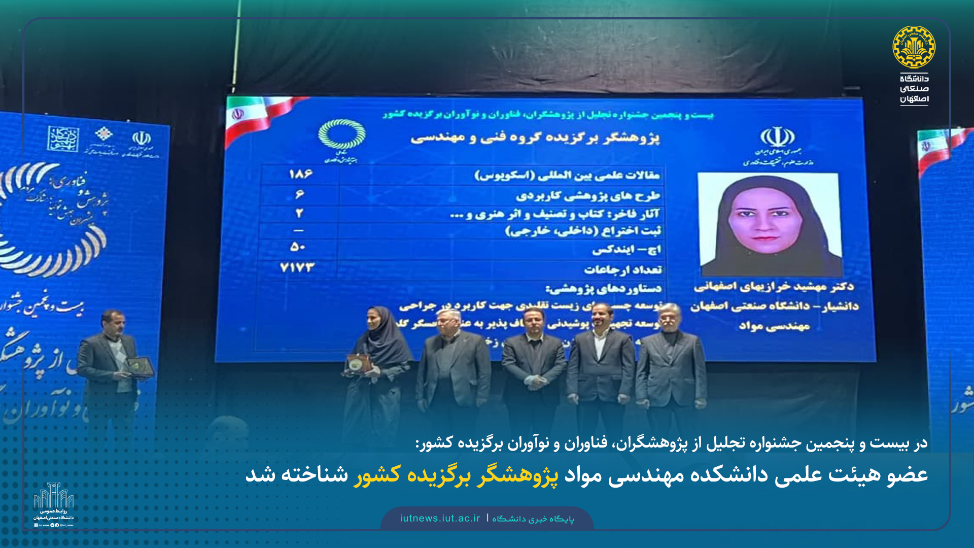 به گزارش روابط عمومی دانشگاه صنعتی اصفهان، دکتر مهشید خرازیها اصفهانی عضو هیئت علمی دانشکده مهندسی مواد دانشگاه صنعتی اصفهان با ارائه ۱۸۶ مقاله علمی بین المللی( اسکوپوس)، ۶ طرح پژوهشی کاربردی، ۲ اثر فاخر و اچ ایندکس ۵۰، پژوهشگر برگزیده برتر حوزه فنی و مهندسی کشور معرفی شد.